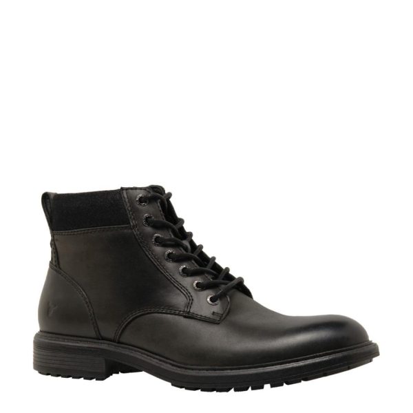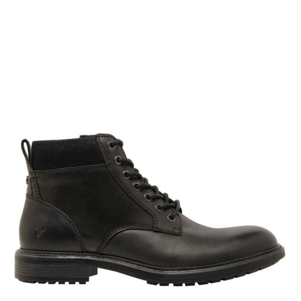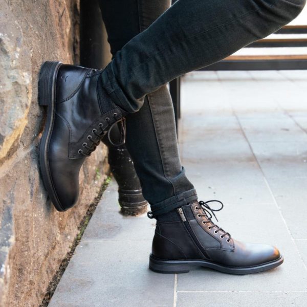 Beau, black lace-up Derby men’s casual boots, featuring seven eyelets. Beau ensures durability and style. Experience enhanced comfort with a padded material collar and easy slip-on access through the inside zip.