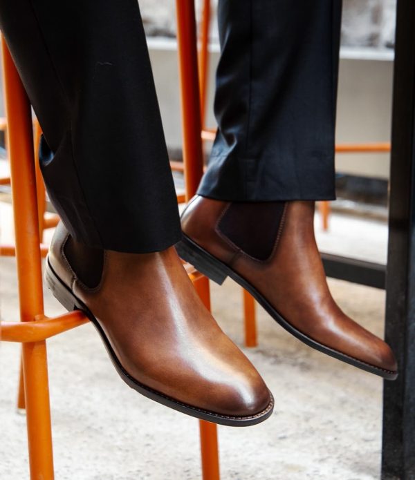 Chelsea tan leather boots featuring an almond toe, elastic side gusset, and a back pull tab, slipping into Daniele is effortlessly smooth. Lightweight resin rubber sole and the hand-finished and stained upper adds a touch of refined detailing.