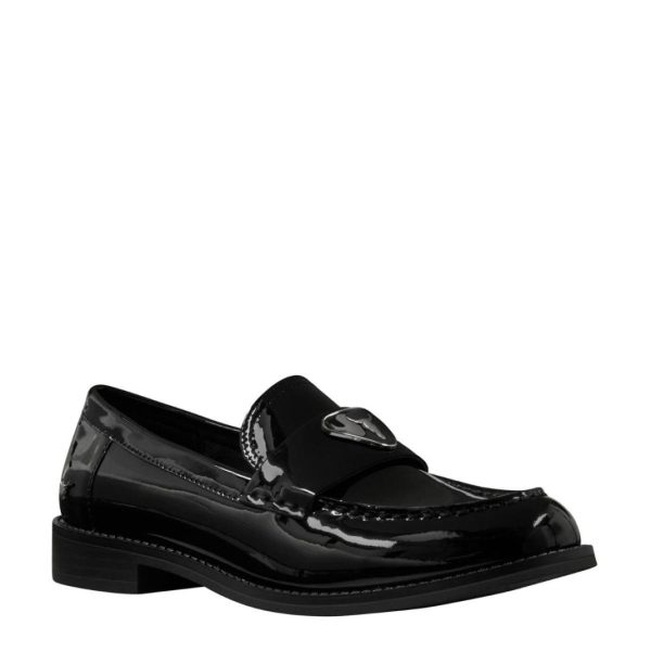 Polite, women’s black patent loafers feature a stylish strap across the upper with the iconic Windsorsmith bull logo ornament detail. A playful twist on the classic loafer, Polite offers a soft foam/jersey lining and a non-slip flexible rubber sole.