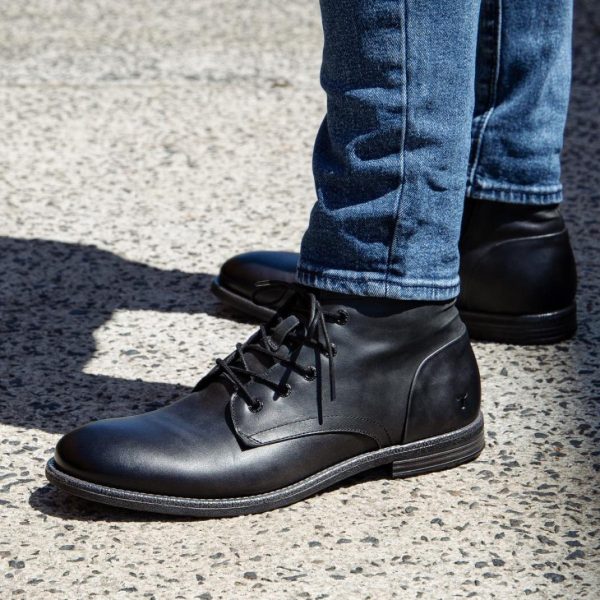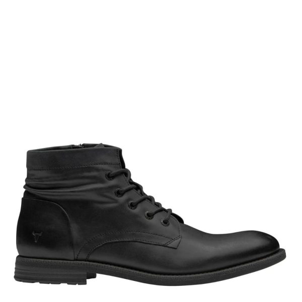 Casual boots in black, redefine casual style with a distressed waxy/oil cow leather finish. Featuring a 5-eyelet lace facing, side zip for easy slipping on, and ruched detailing on the side back of the boot. The lightweight sole and round toe complete the look.