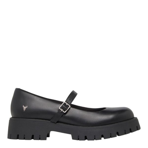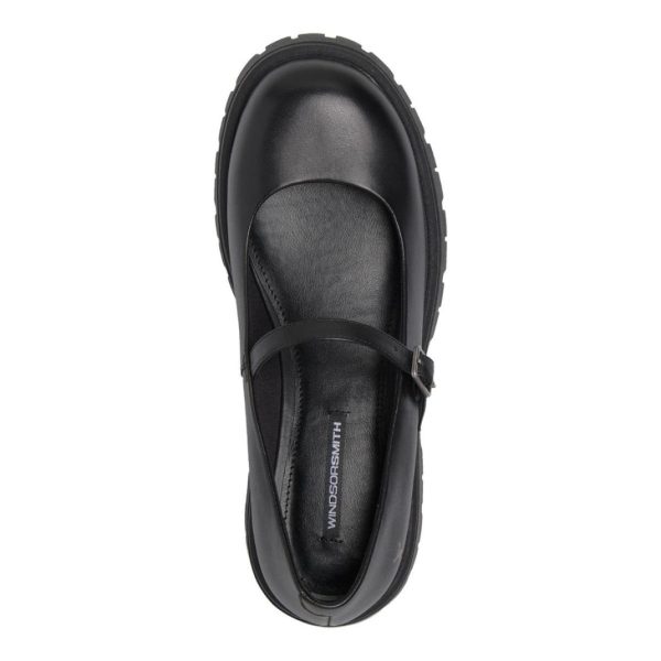 TIMELESS, our quintessential women’s black leather Mary Janes. Featuring a flat chunky cleated sole and strap with buckle fastening.
